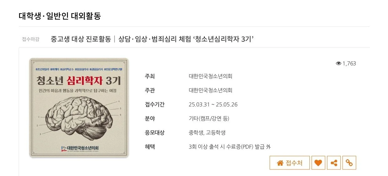 { The Youth Psychologist } 2025.04 ~ 2025.07 1 Completed a 12-week course of psychology lessons and psychiatrist training. Mentored by psychology majors, I explored academic and career pathways within the field of psychology. 2 3 4 Studied core topics including counseling psychology (REBT), abnormal and clinical psychology, criminal profiling, and biopsychology. Engaged in peer discussions and built a youth mental health network with participants. Slide 1 Slide 1 (current slide) Slide 2 Slide 2 (current slide) Slide 3 Slide 3 (current slide) Slide 4 Slide 4 (current slide)